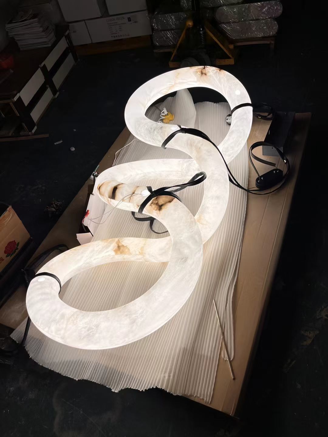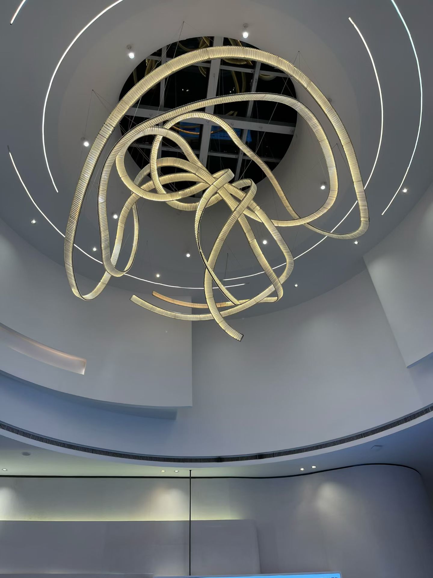 Este elegante lustre apresenta um design exclusivo inspirado em fitas combinado com elementos de cristal de alta qualidade, criando uma mistura perfeita de arte e sofisticação. Totalmente personalizável para projetos não padronizados, é ideal para salões de baile, clubes, lobbies de hotéis e departamentos de vendas. Os componentes de cristal proporcionam uma brilhante refração de luz, criando uma atmosfera luxuosa e convidativa.